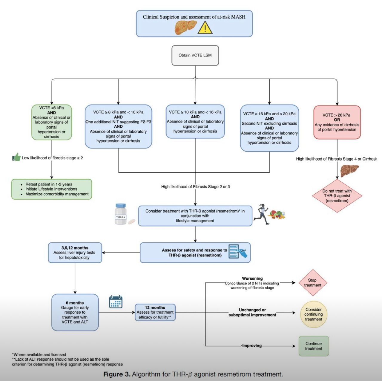 Management emphasizes personalized, stepwise approaches: foundational lifestyle modifications (Mediterranean diet, 150 min/week aerobic exercise) targeting 7-10% weight loss to reverse steatosis in 50-80% of cases. Pharmacologic options include pioglitazone/statins for non-cirrhotic MASH, semaglutide/tirzepatide for weight-related fibrosis, and resmetirom (FDA-approved 2024) for biopsy-confirmed MASH F2-F3. Bariatric surgery is endorsed for eligible obese patients. Follow-up intervals vary by stage (q6-12 months for advanced disease), incorporating HCC surveillance (US/MRI q6 months in cirrhosis).