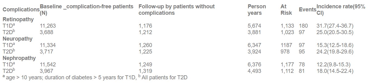 In the YDR, 21,728 individuals with young onset diabetes, (65.3 % T1D (N=14,194), 24.0% T2D (N=5218) were enlisted. The age adjusted incidence of retinopathy was 31.7 /1000 person years (CI: 27.4-36.7) in T1DM and 25.0 /1000 person years (CI 20.5-30.5) in T2D; neuropathy, 15.3 (CI 12.5-18.6) and 24.2 (CI 19.8-29.6); and nephropathy, 12.2 (CI 9.8-15.3) and 18.0 (CI 14.5-22.4) in T1D and T2D, respectively (Table 1).