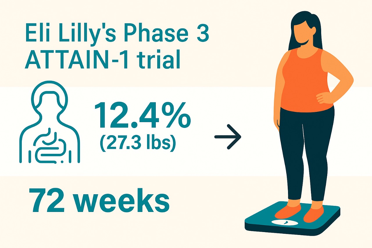ATTAIN-1 (NCT05869903), a 72-week, randomized, double-blind, placebo-controlled trial, enrolled 3,127 participants across multiple countries with BMI ≥30 kg/m² or ≥27 kg/m² with comorbidities (e.g., hypertension, dyslipidemia). Participants received orforglipron (6 mg, 12 mg, or 36 mg) or placebo once daily, alongside diet and exercise counseling. Primary endpoint was percent body weight reduction at 72 weeks (efficacy estimand). Secondary endpoints included proportions achieving ≥10% and ≥15% weight loss and cardiovascular risk marker changes. Safety was assessed via adverse event monitoring.