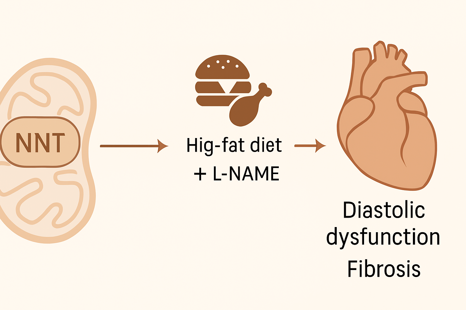 The study investigates the role of mitochondrial nicotinamide nucleotide transhydrogenase (NNT) in the development of heart failure with preserved ejection fraction (HFpEF), particularly in the context of cardiometabolic disease. HFpEF is a complex condition lacking effective therapies, and current preclinical models often rely on a “two-hit” approach—combining a high-fat diet with L-NAME (a nitric oxide synthase inhibitor)—to induce HFpEF-like features in mice.